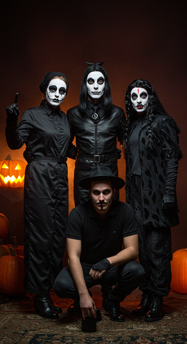 Embrace the shadows with a mysterious and monochromatic group costume! This idea is perfect for those who love a dark and edgy aesthetic. The all-black attire creates a striking backdrop for the dramatic sugar skull makeup, resulting in a hauntingly beautiful effect. TIP: Focus on the details! Experiment with different textures and fabrics to add depth and dimension to your all-black ensembles. Think leather, lace, and velvet for a touch of gothic flair.