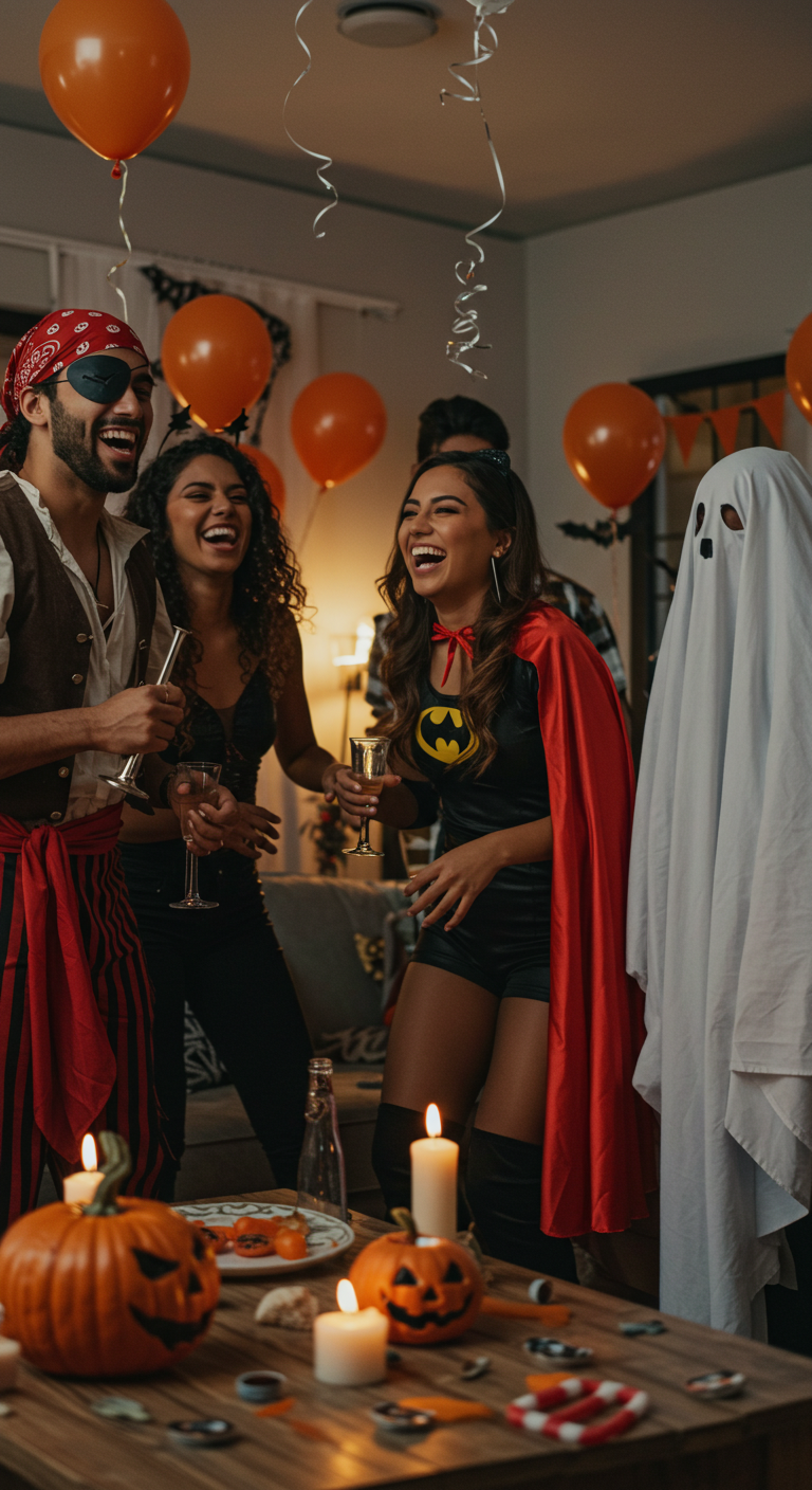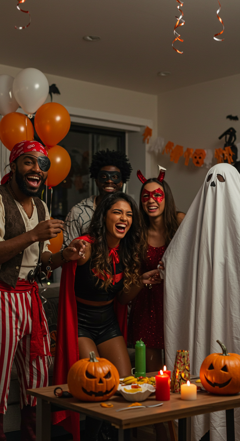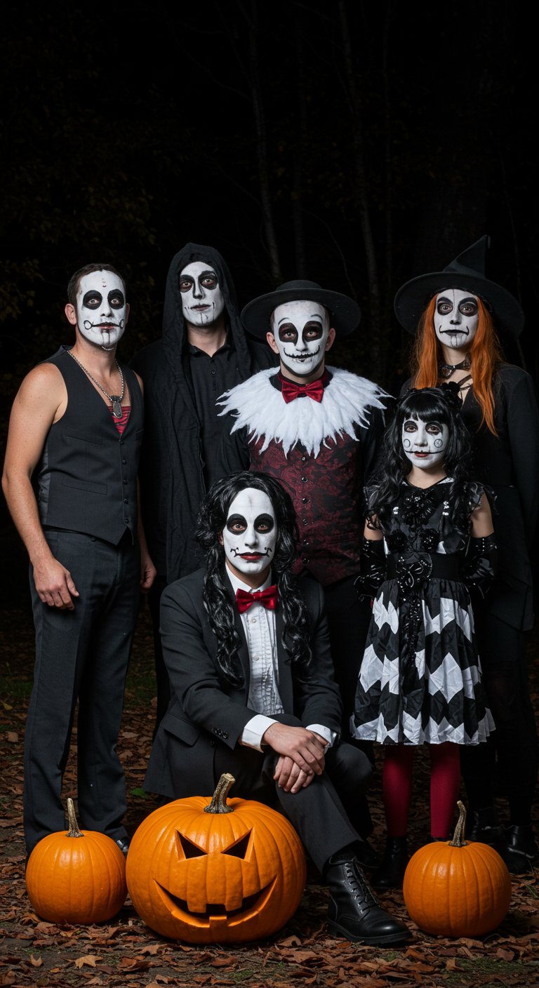 Elevate your Halloween with a sophisticated Sugar Skull theme! This idea is all about combining elegant attire with intricate sugar skull makeup for a look that’s both spooky and stylish. It’s special because it’s a unique twist on a classic Halloween theme, perfect for a more mature or upscale celebration. TIP: Coordinate your outfits! Choose a color palette or style that complements each other to create a cohesive and visually stunning group.