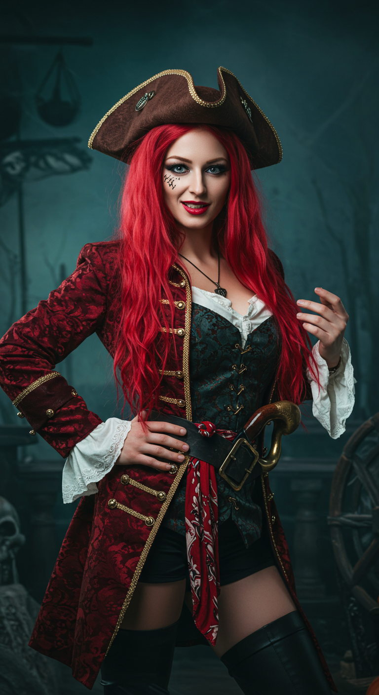 Lead your crew in style with this fierce pirate captain costume! The leather jacket and detailed accessories create a powerful and commanding look. The fiery red curls add a touch of wildness and rebelliousness. Tip: Add a dramatic eye patch and some bold eyeliner to enhance the pirate look! Get ready to take charge and command the Halloween seas!