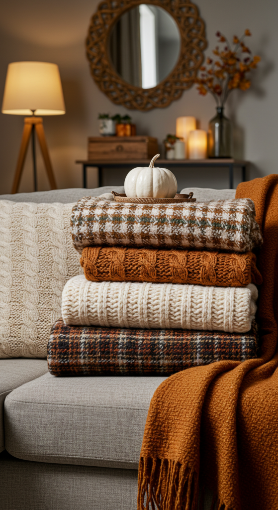 Drape them casually over your sofa arms, fold them neatly at the foot of the couch, or create an artful pile in a woven basket nearby. This layering technique not only provides practical warmth but also creates a lived-in, inviting atmosphere that screams autumn comfort.