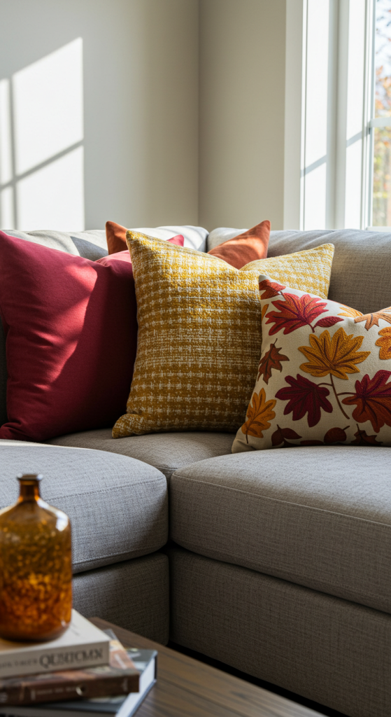 Create the ultimate cozy corner by mixing and matching throw pillows in various autumn-inspired patterns, textures, and sizes. Start with larger solid-colored pillows in warm neutrals like cream, camel, or warm gray as your foundation. Then add medium-sized pillows in classic fall patterns such as buffalo plaid, leaf motifs, or geometric designs in rust, burgundy, and gold tones.
