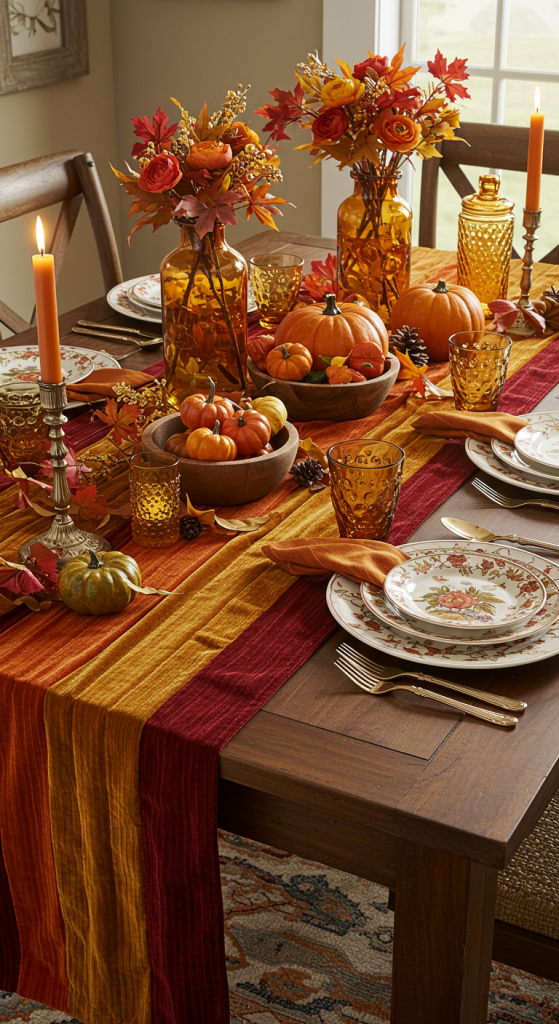 Elevate your dining experience by layering table runners in complementary fall colors and textures. Start with a neutral linen or burlap runner as your base, then add a narrower runner in a rich autumn hue like deep orange, burgundy, or forest green on top. For added visual interest, choose runners with different textures—perhaps a smooth cotton base with a textured jute or woven overlay.