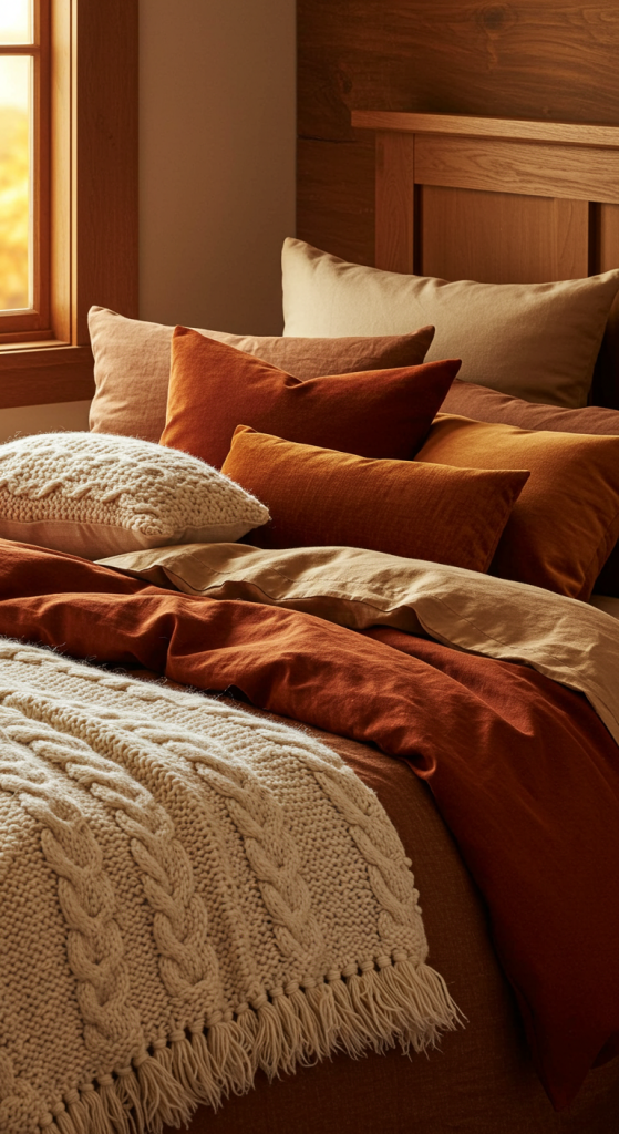 Transform your bedroom into an autumn sanctuary with luxurious layered bedding. Start with high-quality sheets in warm neutrals, add a lightweight blanket or coverlet in a rich fall color, then layer on a duvet or comforter in a complementary tone. Top it off with a throw blanket at the foot of the bed and an assortment of pillows in various sizes and textures.