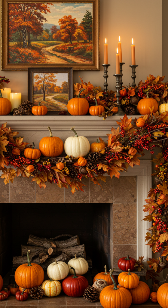 Create a stunning focal point by layering decorative elements on your mantel or fireplace surround. Start with a backdrop of autumn garland or fall leaves, then add varying heights of candles, pumpkins, and seasonal decor. Layer in artwork or mirrors behind the arrangement, and include natural elements like branches, pinecones, and gourds.