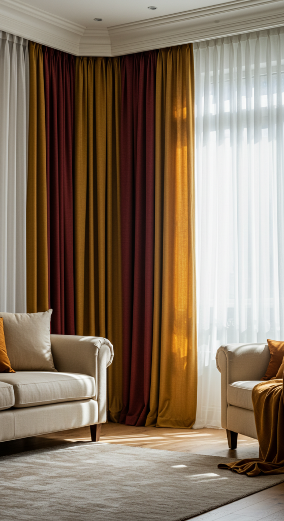 Add depth and warmth to your windows with layered autumn treatments. Combine sheer curtains in warm cream or champagne with heavier drapes in rich fall colors like burnt orange, deep red, or forest green. Add a coordinating valance or roman shade for extra texture and light control.