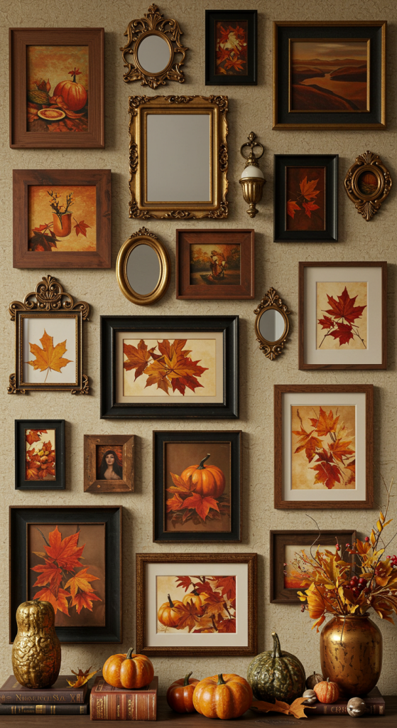 Vary the frame styles and colors—combine natural wood frames with painted options in deep autumn hues. Include a mix of sizes and orientations to create an organic, collected-over-time feel.