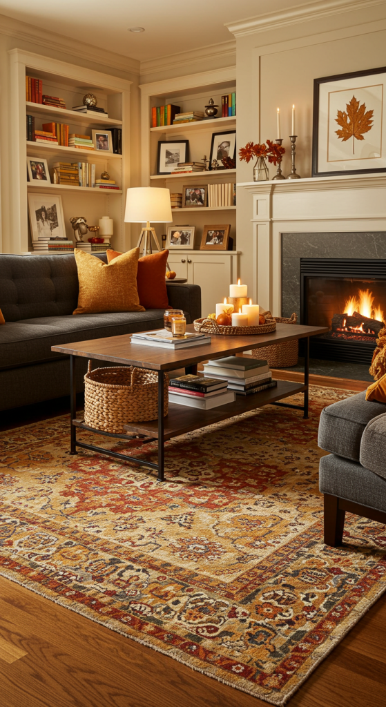 Ground your autumn decor with beautifully layered rugs and floor treatments. Start with a larger neutral rug as your base, then layer a smaller patterned rug on top in autumn colors. This works particularly well in living rooms, bedrooms, and dining areas.