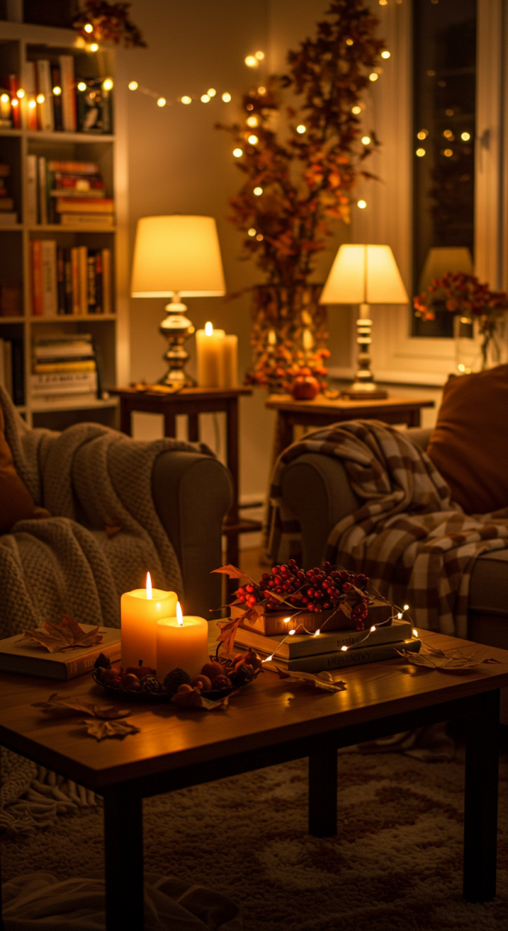 Add seasonal lampshades in autumn colors, incorporate candles of various heights and scents, and consider string lights with warm white or amber bulbs for extra magic. Battery-operated candles in lanterns can add the flickering effect without the fire hazard.