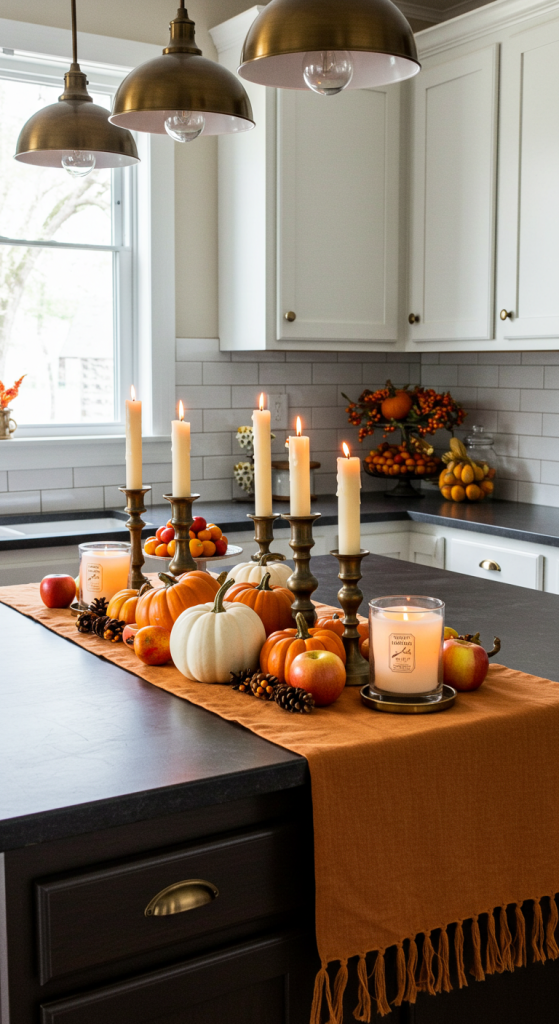 Transform your kitchen island into an autumn centerpiece with thoughtful layering. Start with a beautiful runner or placemats, add varying heights of seasonal decor like small pumpkins, gourds, and candles. Include practical elements like a fruit bowl filled with autumn produce—apples, pears, and pomegranates.