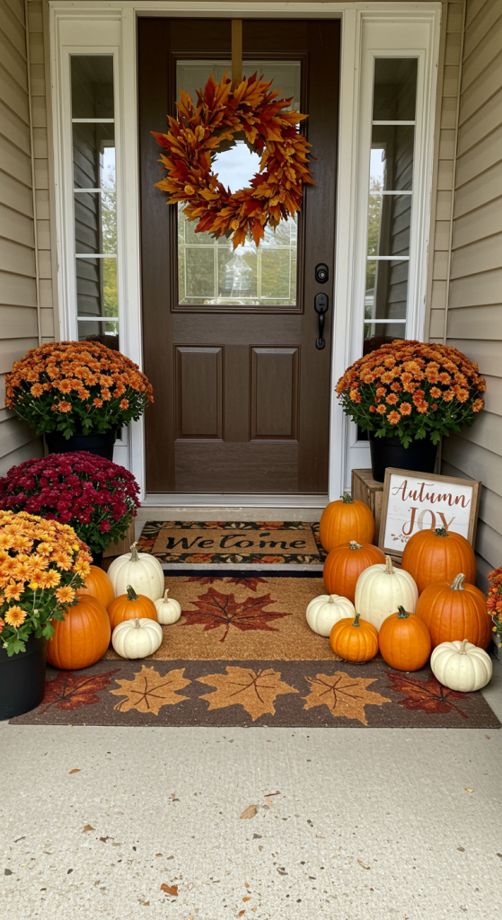 Make a stunning first impression with a layered autumn entryway display. Combine a seasonal doormat with potted mums or fall plants at varying heights, add a decorative ladder or bench for visual interest, and layer in pumpkins, gourds, and seasonal signage.