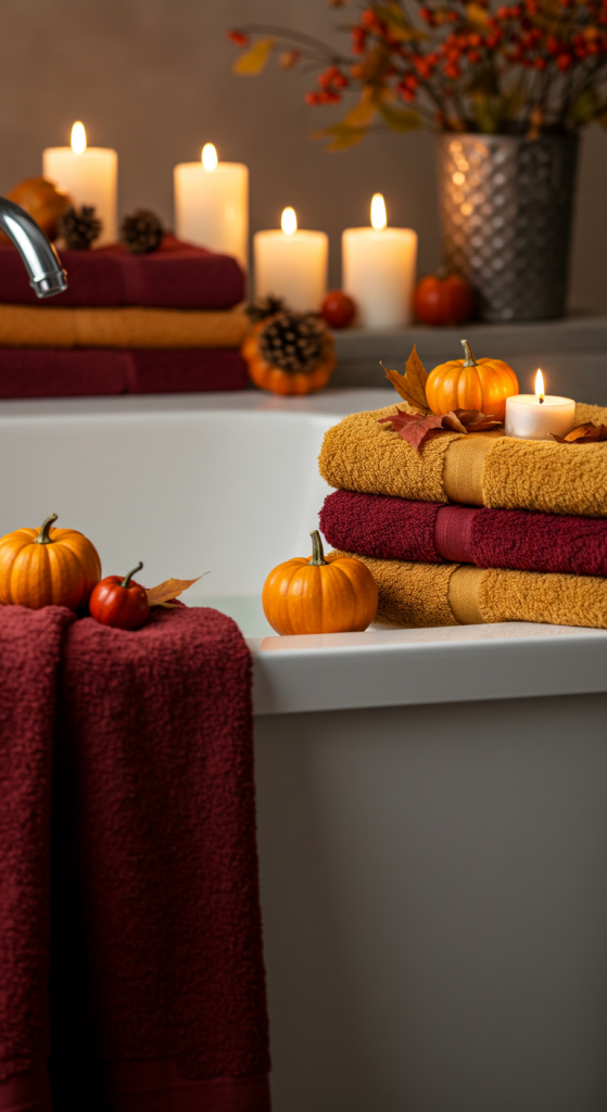 Bring autumn coziness to your bathroom with layered towels, bath mats, and seasonal accessories. Stack plush towels in autumn colors like rust, cream, and sage green. Add a cozy bath mat and layer in seasonal elements like candles, small pumpkins, and autumn-scented toiletries.