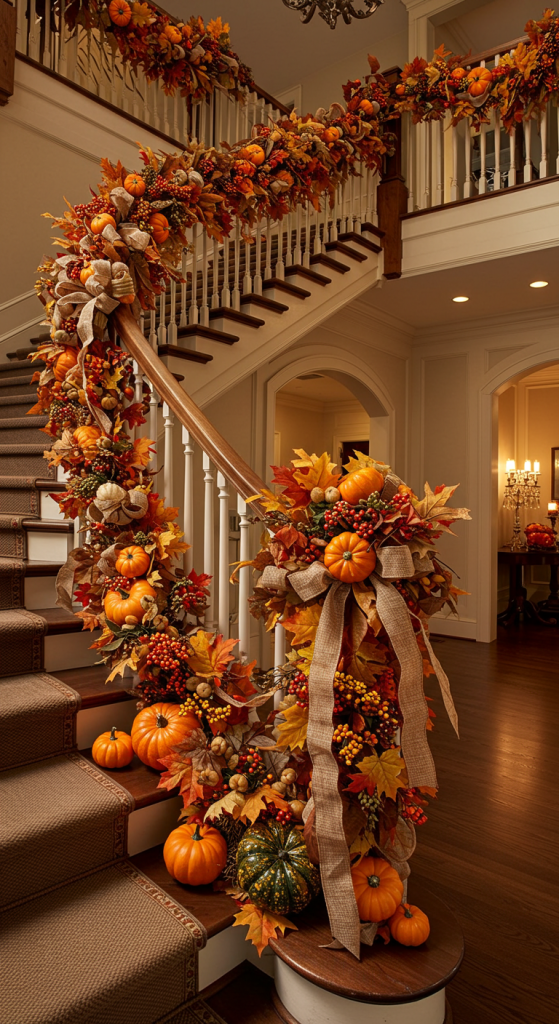 Transform your staircase into an autumn showpiece with layered garland and seasonal decor. Wrap fall garland around the banister, weaving in additional elements like ribbon in complementary colors, small battery-operated lights, and mini pumpkins or gourds.