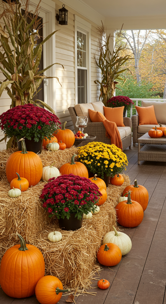 Create an inviting autumn entrance with multiple layers of fall decor on your porch or patio. Start with larger elements like hay bales or decorative urns as your foundation, then layer in medium-sized pumpkins, cornstalks, and mums in pots of varying heights.