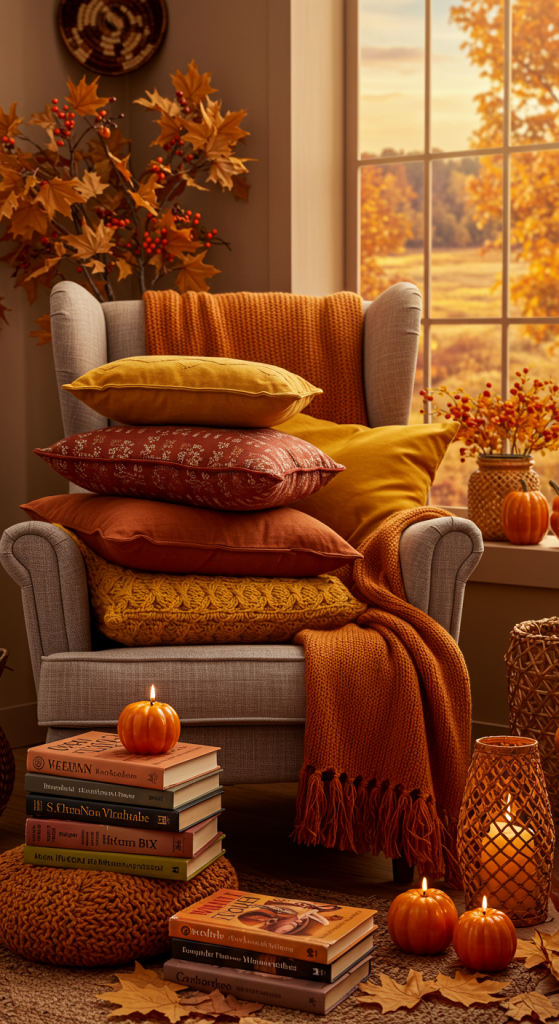 Create the perfect autumn reading retreat by layering comfort elements in a corner or window seat. Start with soft cushioning, add multiple throw pillows in autumn colors and textures, drape a cozy blanket nearby, and include a small side table for your coffee or tea.