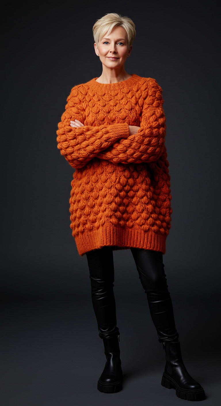 Make a statement this fall with a bold sweater dress! This textured orange sweater dress is a showstopper. The unique bubble knit adds a playful touch to this classic silhouette. Dress it up with knee-high boots for a night out or keep it casual with leggings and ankle boots. Pro tip: Add a belt to cinch your waist and create a more defined shape. This sweater dress is guaranteed to turn heads!