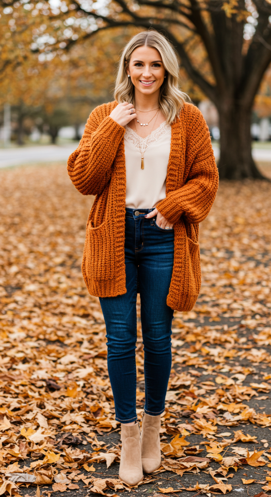 Wrap yourself in autumn bliss with an oversized burnt orange cardigan paired with high-waisted dark wash jeans and tan ankle boots. This effortlessly chic look is perfect for apple picking or casual coffee dates. Layer a cream-colored camisole underneath and add a delicate gold necklace for that extra touch of elegance.