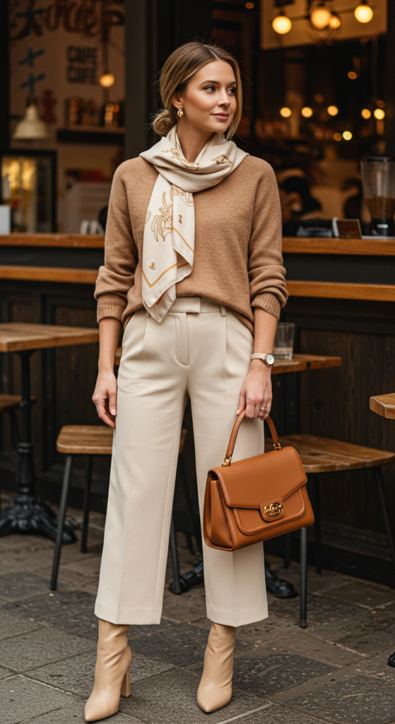 Master the art of fall layering with a cream base layer, camel cardigan, rust-colored scarf, and cognac boots. This outfit teaches you how to build warmth while maintaining style.