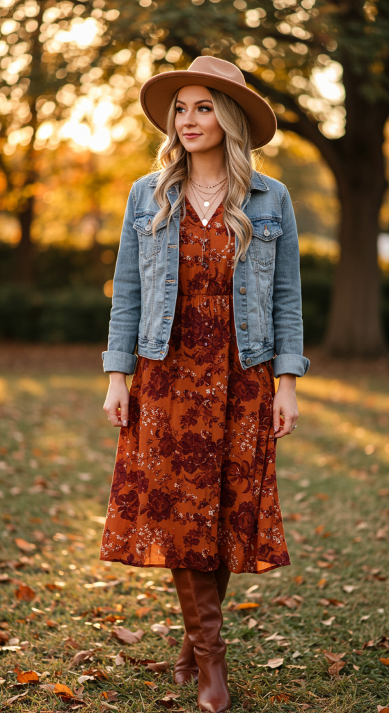 Embrace your feminine side with a flowing rust-colored midi dress featuring delicate floral prints in deep burgundy and gold. Pair with brown leather knee-high boots and a denim jacket for that perfect balance of romantic and casual.