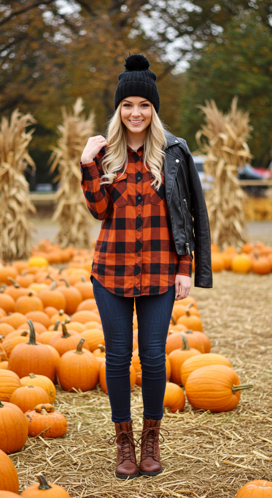 Perfect for actual pumpkin patch visits! Combine orange plaid flannel with dark skinny jeans, brown combat boots, and a black leather jacket. This edgy-meets-cozy look is ideal for outdoor fall activities.