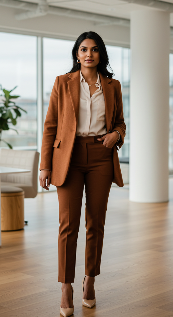 Elevate your fall wardrobe with a terracotta blazer over a cream silk blouse, paired with high-waisted trousers in deep chocolate brown. Add pointed-toe pumps in nude for a look that’s perfect for professional settings.