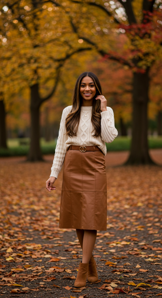 Create visual interest with a cream cable-knit sweater and nutmeg-colored leather skirt. Add cognac ankle boots and gold jewelry for a look that’s both cozy and elevated.