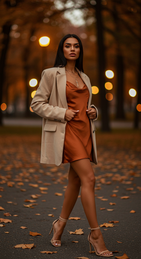 Make a statement with a ginger-colored satin slip dress layered under an oversized beige blazer. Complete the look with strappy heeled sandals and delicate gold jewelry.