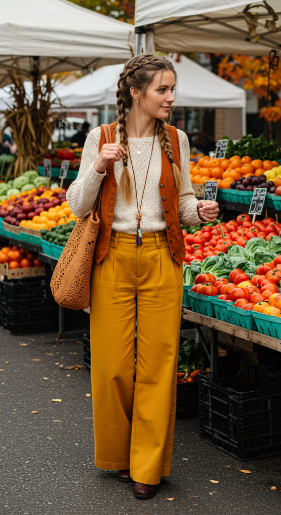 Channel harvest season with mustard yellow wide-leg pants, a cream knit top, and a rust-colored vest. Add brown leather accessories and you’re ready for any fall festival.