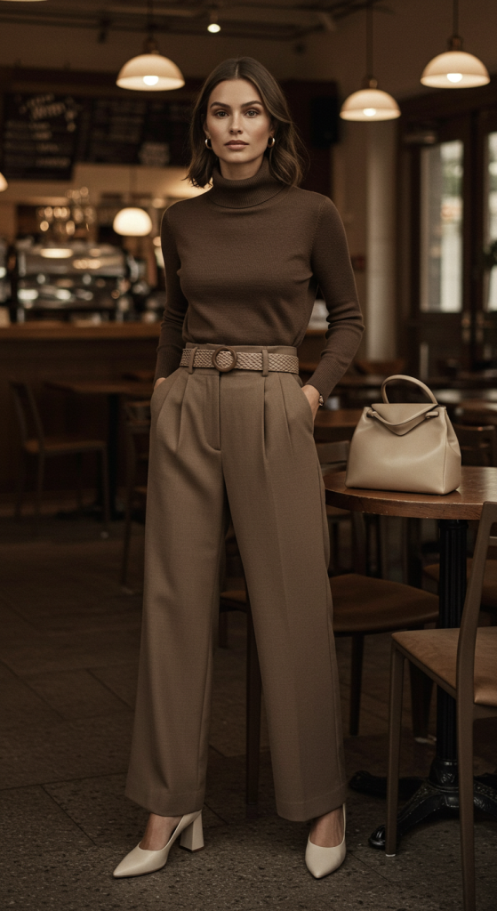 Indulge in rich, coffee-inspired tones with a chocolate brown turtleneck, mocha-colored wide-leg trousers, and cream block heels. This monochromatic look is sophisticated yet approachable.