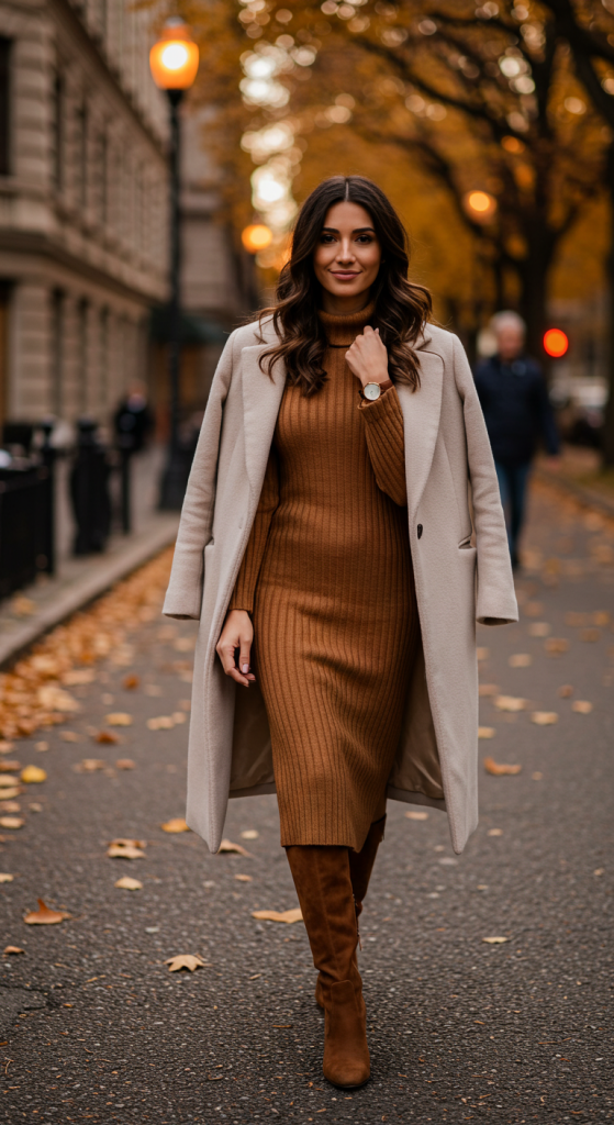 Go bold with a cinnamon-colored midi dress in ribbed knit fabric, paired with knee-high boots in matching brown and a cream coat for contrast.