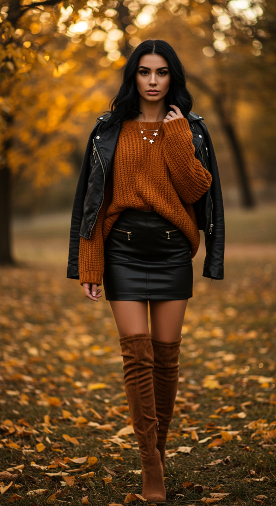 End our list with a celestial-inspired look featuring a deep orange sweater, black leather skirt, cognac over-the-knee boots, and gold star jewelry for that magical autumn evening vibe.