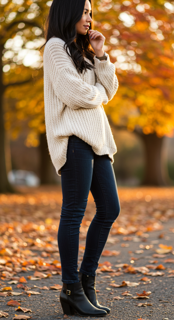 Choose black or brown leather ankle booties with a slight heel for the most versatile option. Dark wash skinny jeans create a sleek silhouette that allows your boots to take center stage. Layer on a chunky knit sweater in cream, camel, or forest green – the oversized fit adds cozy autumn vibes while maintaining a polished appearance. Complete the look with a structured crossbody bag and delicate jewelry.