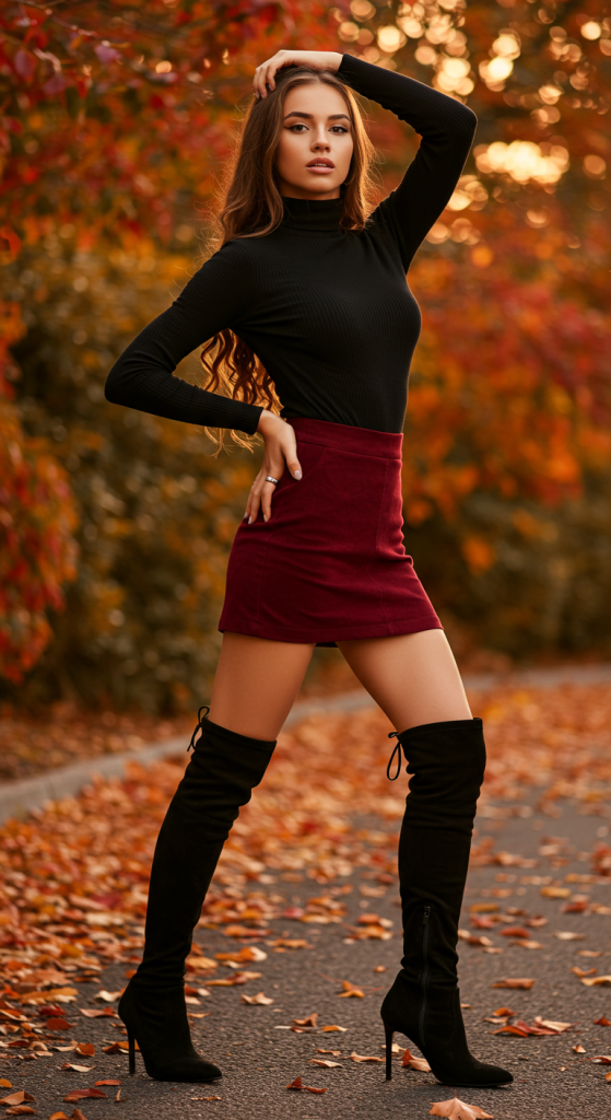 Opt for sleek leather or suede knee-high boots in black, brown, or deep burgundy. Choose a mini skirt in a rich fall fabric like wool, corduroy, or faux leather – A-line or pleated styles work particularly well. Layer with a fitted turtleneck in a complementary color. The turtleneck provides warmth while creating a streamlined silhouette that pairs beautifully with the boots’ height.