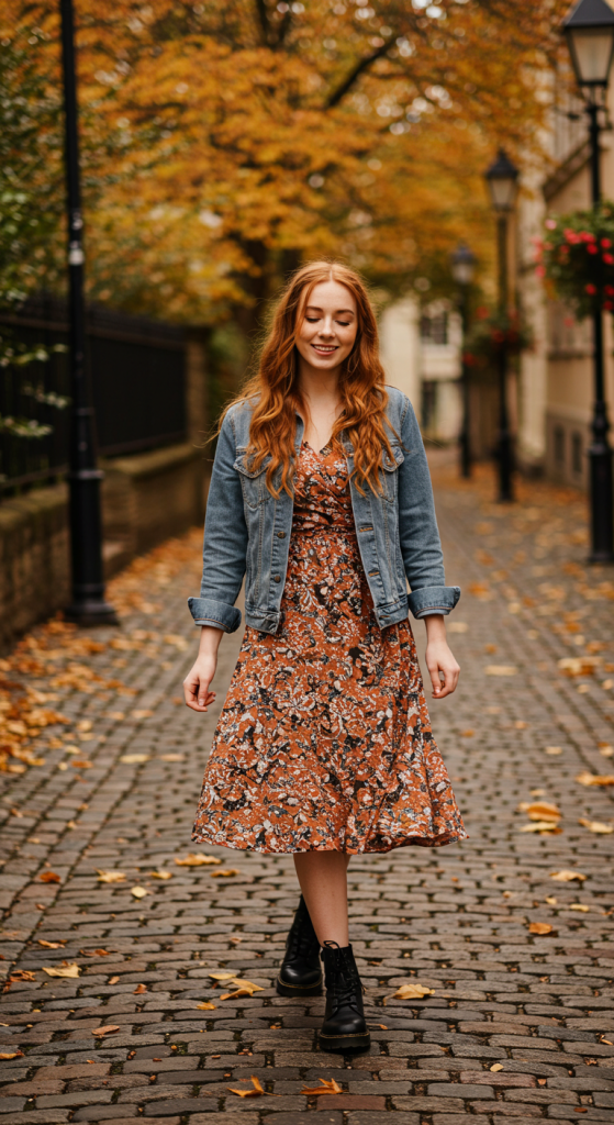 Select sturdy black combat boots with interesting details like buckles or lacing. Choose a midi dress in a soft, flowing fabric like chiffon or jersey – floral prints, solid earth tones, or subtle stripes all work beautifully. Layer with a classic denim jacket for the perfect finishing touch. The contrast between the delicate dress and robust boots creates visual interest while the denim jacket adds an extra layer of casual cool.