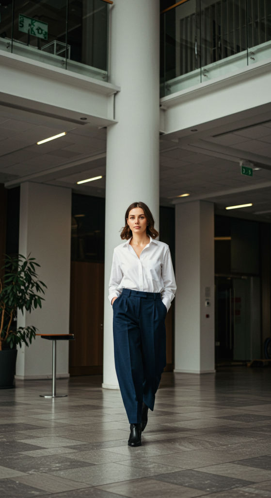 Select black or brown leather Chelsea boots with clean lines and minimal hardware. Choose wide-leg trousers in a structured fabric like wool or cotton blend – neutral colors like black, navy, or camel work best. Pair with a crisp white button-down shirt or opt for a silk blouse in a complementary color. The key is tucking in your top to define your waistline and maintain the outfit’s polished appearance.