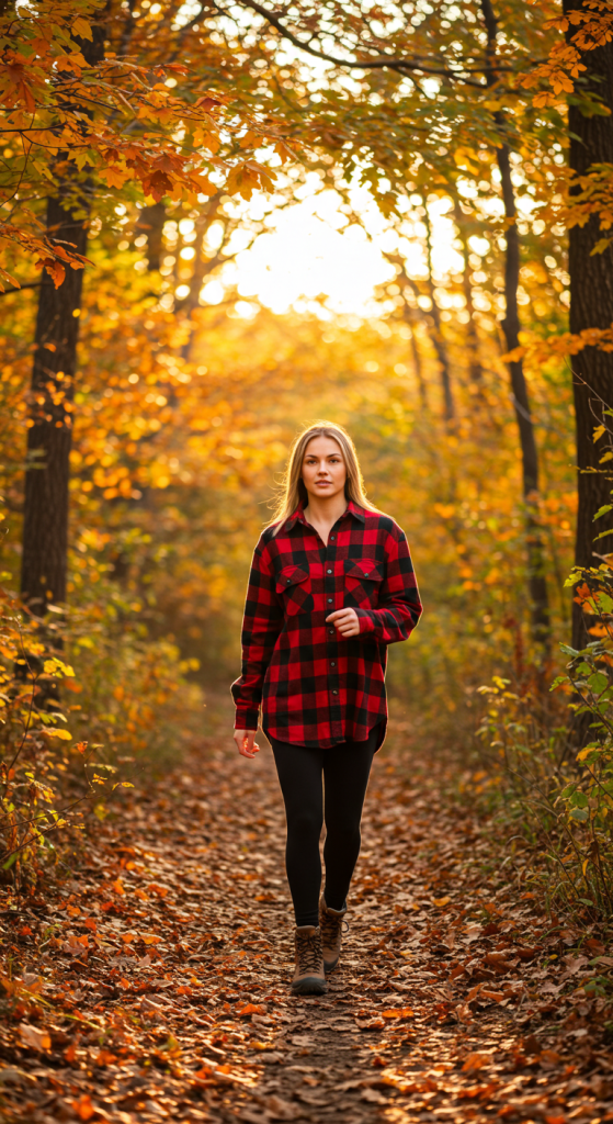 Choose sturdy hiking boots in brown leather or neutral tones with good tread and ankle support. Pair with high-quality black or dark gray leggings that won’t be see-through when you bend or move. Layer an oversized flannel shirt in classic patterns like plaid or buffalo check over a fitted basic tee. The flannel can be tied around the waist or worn open as a light jacket.