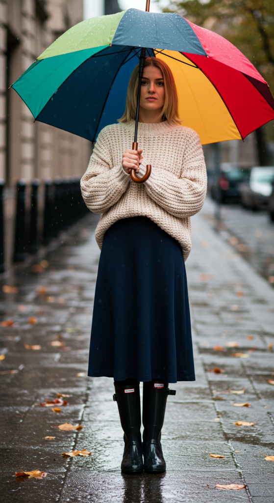 Don’t let rainy fall weather dampen your style! Rain boots can be surprisingly chic when paired with the right pieces. A midi skirt and cozy cardigan create a look that’s both practical and feminine.