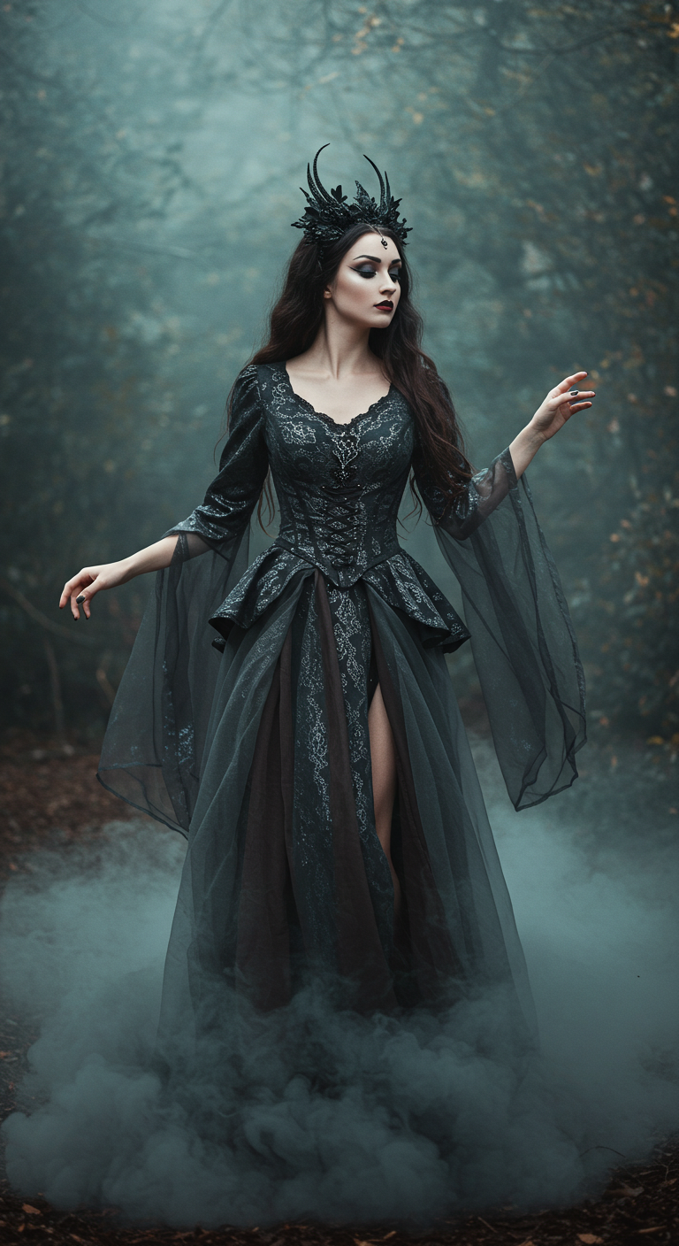 Obsessed with this dark and dreamy look! The structured bodice paired with flowing sleeves and skirt is pure magic. This costume is all about commanding attention with an air of mystery. For extra drama, add a smoky eye and a statement crown. Feeling crafty? DIY your own crown with twigs and black spray paint! You’ll be the queen of the night, guaranteed.